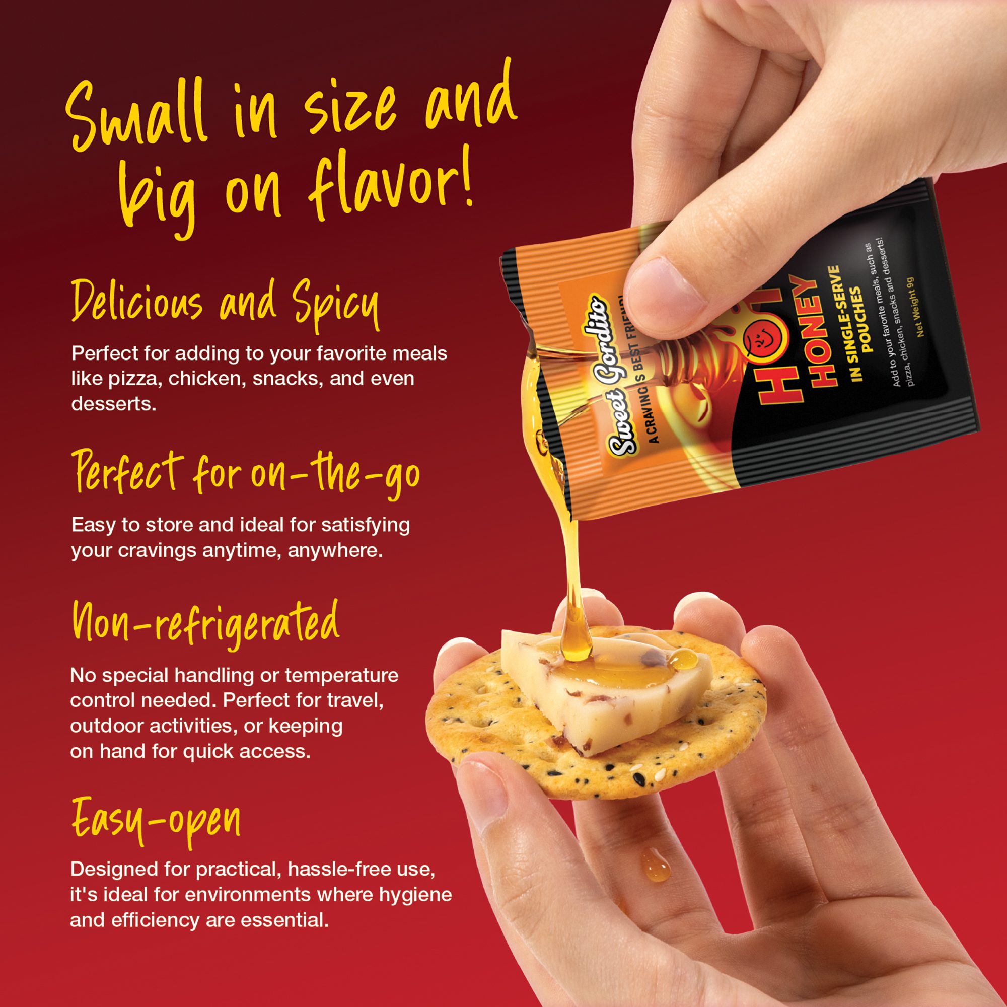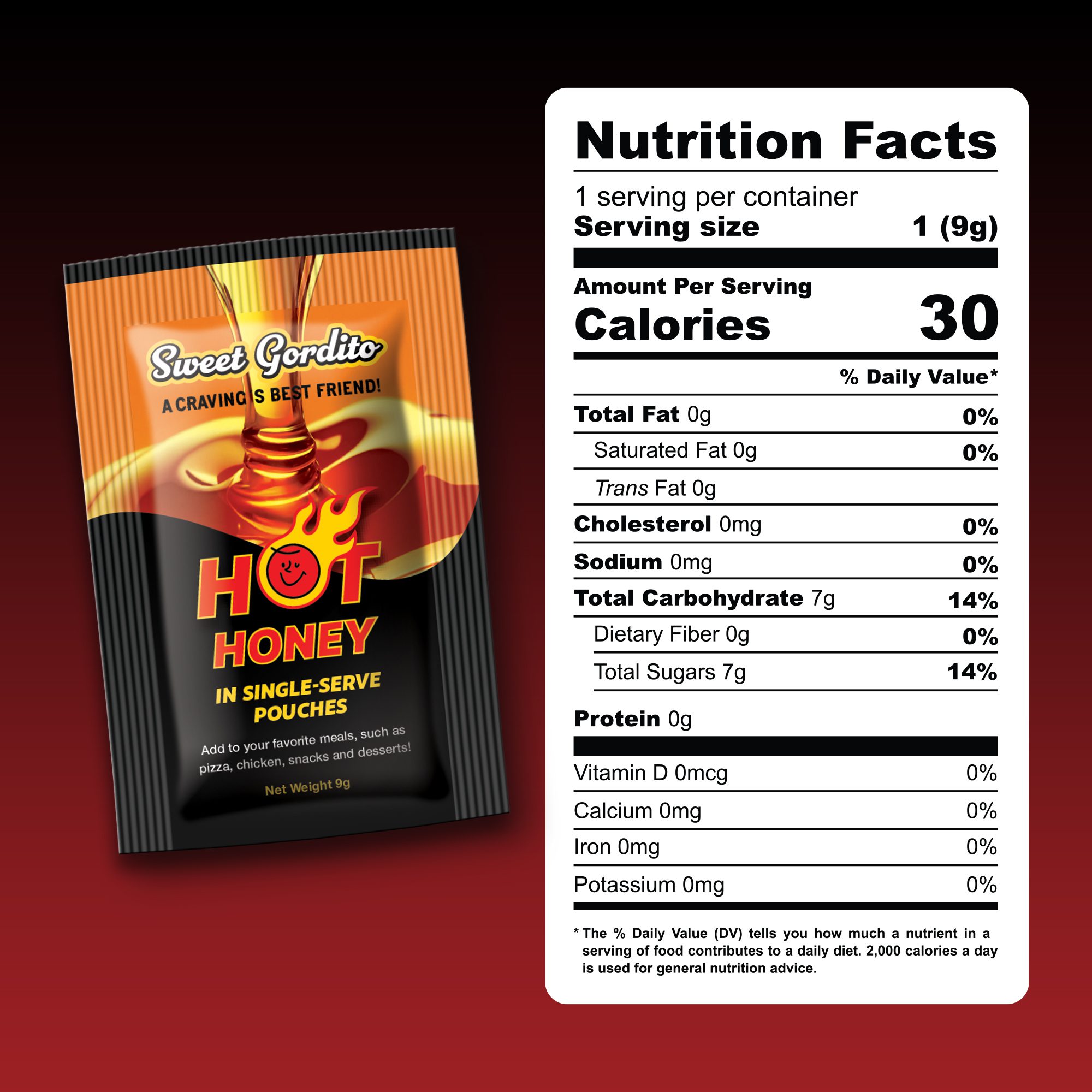 Sweet Gordito Spicy Hot Honey delivers the perfect balance of natural sweetness and bold heat. Made from pure raw honey infused with real chili, this irresistible hot honey comes packaged in 30 convenient single-serve 9g sachets, making it easy to enjoy at home, on the go, or anywhere flavor is needed.